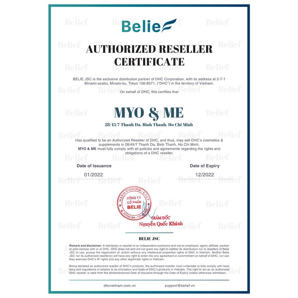 Mua tại TiktokThực phẩm này không phải là thuốc, không có tác dụng thay thế thuốc chữa bệnh Quy cách: túi 30 ngày (60 viên) Khối lượng viên: 200 ± 15mg Xuất xứ: hãng DHC Nhật Bản (nhập khẩu bởi công ty Bellie) Liều dùng: 1 ngày 2 viên, trong hoặc sau bữa ăn đều được.