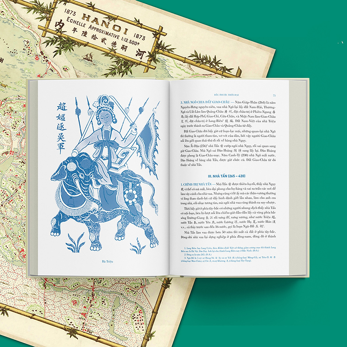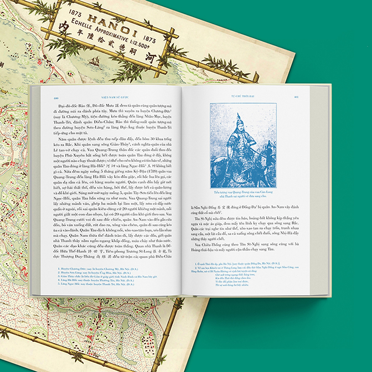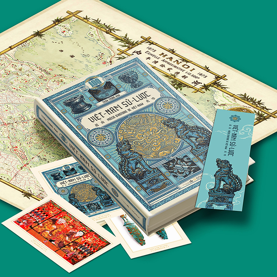 Ấn bản cao cấp Việt Nam sử lược có bìa cứng, ruột in 2 màu trên giấy GV76-BB định lượng 100gsm, quà tặng kèm gồm bản đồ, bookmark và bộ postcard 8 tấm.