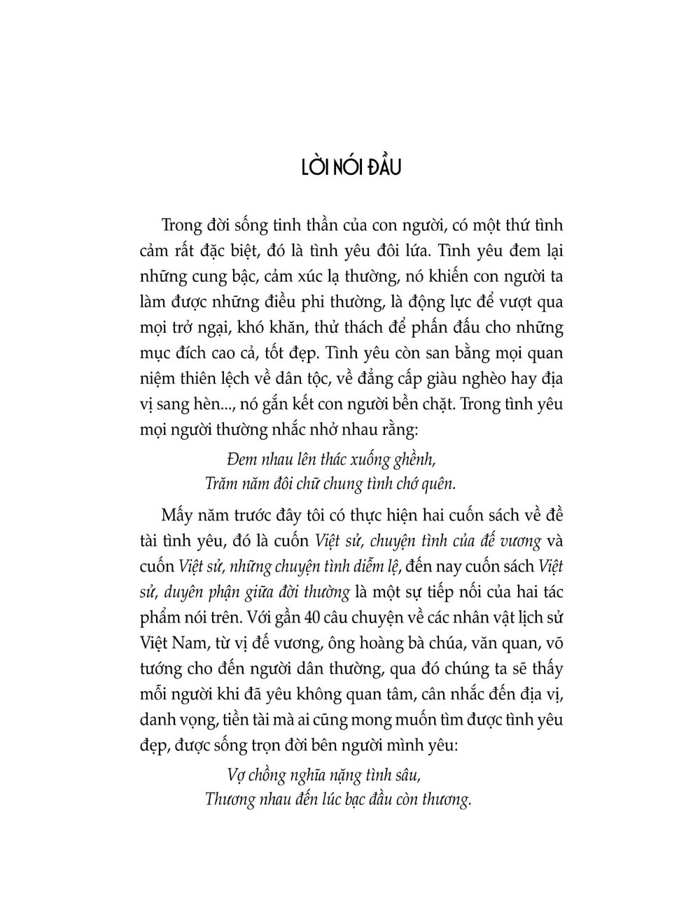 Duyên cầm sắt vững bền theo năm tháng, Nghĩa tào khang thắm thiết đến muôn đời. Mỗi câu chuyện tình đều chứa đựng một giá trị nhân văn sâu sắc, nó là bài học đối nhân xử thế, có tác dụng giáo dục về quan niệm đúng đắn trong tình yêu. Hy vọng cuốn sách này sẽ giúp bạn đọc có thêm được những thông tin hấp dẫn, bất ngờ về đời tư, tình cảm của một số nhân vật nổi tiếng trong lịch sử Việt Nam.