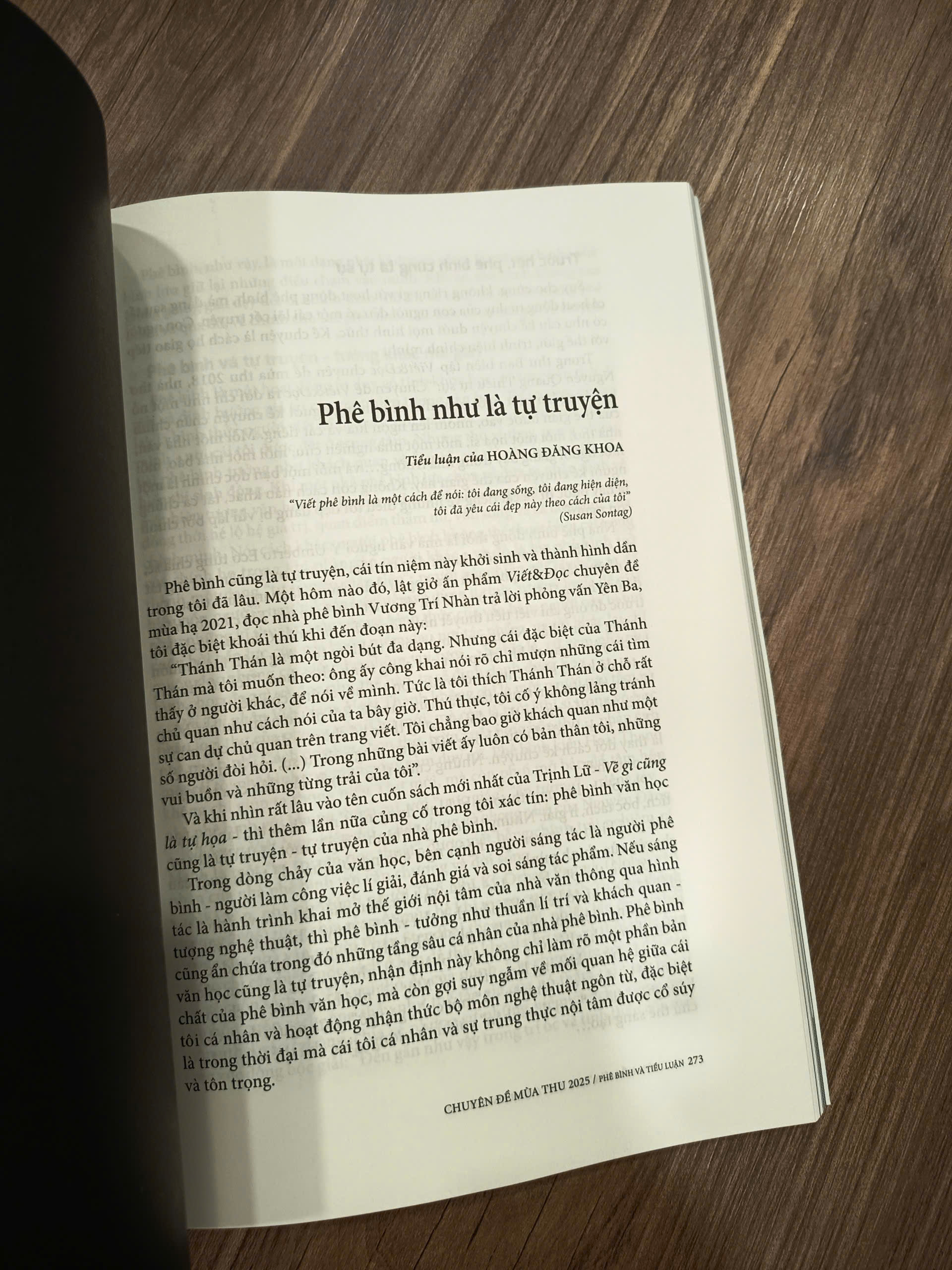 Khi trời bắt đầu se lạnh và lá vàng lặng lẽ rụng, Viết và Đọc — Chuyên đề Mùa Thu 2025 (NXB Hội Nhà Văn) xuất hiện như một khung cửa mời gọi: không ồn ào, không áp đặt, chỉ nhẹ nhàng hé mở thế giới ngôn từ cho người viết và người đọc. Đây không phải là cẩm nang với công thức viết hoàn chỉnh, mà là một bản hợp âm của nhiều tiếng nói — từ nhà văn, nhà phê bình đến độc giả — cùng chia sẻ kỹ thuật, trải nghiệm và trăn trở về văn chương và đời sống. Quyển sách được xây dựng từ những bài viết nhỏ: kỹ thuật viết, ghi chép đời thường, phân tích tác phẩm và tiểu luận lý thuyết. Bạn có thể đọc rời từng mẩu văn như nhặt từng hòn sỏi ven đường, nhưng khi ghép lại, vẫn cảm nhận được chiều sâu mềm mại. Mỗi bài là một viên gạch nhỏ: có viên giúp gieo ý, có viên làm bóng câu chữ, có viên đặt lại vấn đề về vai trò của văn học hôm nay. Ngôn ngữ trong nhiều bài không cao xa mà gần gũi, như người trò chuyện nghiêm túc nhưng không nặng lời. Đôi khi là mẩu ghi chép chợt đến trong buổi sáng tinh mơ, đôi khi là câu hỏi không lời đáp về trách nhiệm của tiếng viết giữa dòng đời. Những khoảng lặng ấy không làm sách trống rỗng, mà cho phép nhịp thở riêng của người đọc len vào. Nếu bạn mong tìm một mạch lý luận rõ rệt xuyên suốt, có thể sẽ thấy thiếu. Nhưng nếu bạn đến với sách như tìm một đồng hành nhỏ — một gợi ý, một kỹ thuật, một câu hỏi — Viết và Đọc — Chuyên đề Mùa Thu 2025 sẽ là người bạn nhẹ nhàng và kiên nhẫn. Hãy mở sách khi chiều bắt đầu rơi, để từng con chữ nhẹ thì thầm trong lòng bạn.