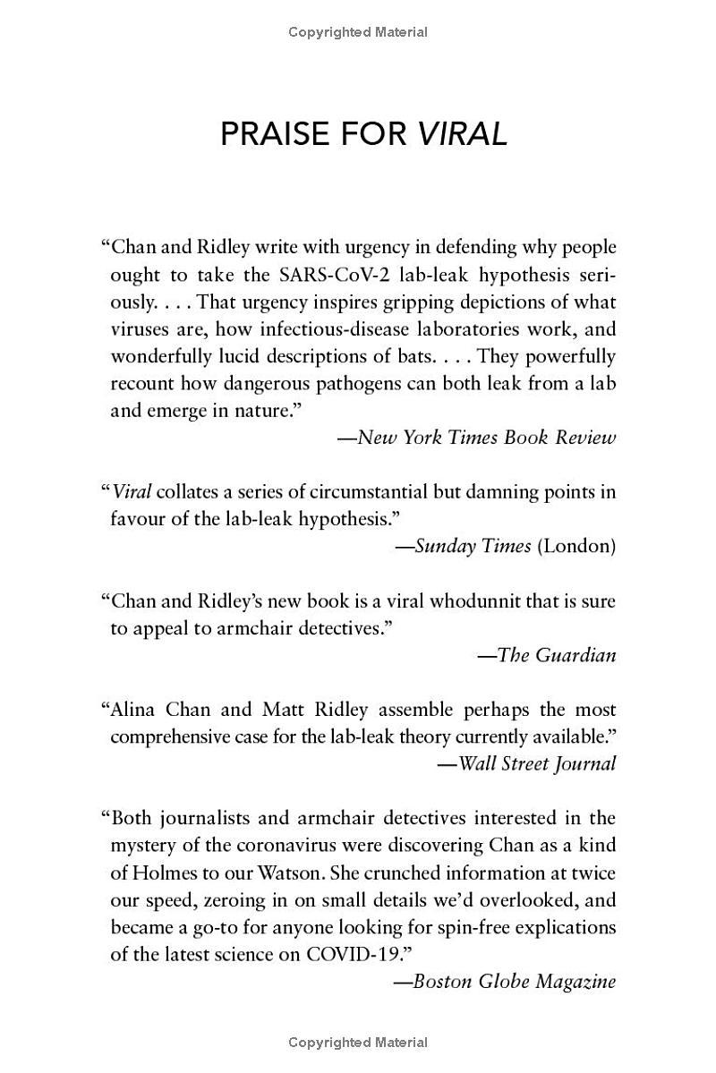 "Chan and Ridley write with an inspires gripping depictions of what viruses are, how infectious-disease laboratories work and wonderfully lucid descriptions of bats. . . . They powerfully recount how dangerous pathogens can both leak from a lab and emerge in nature." (New York Times Book Review)