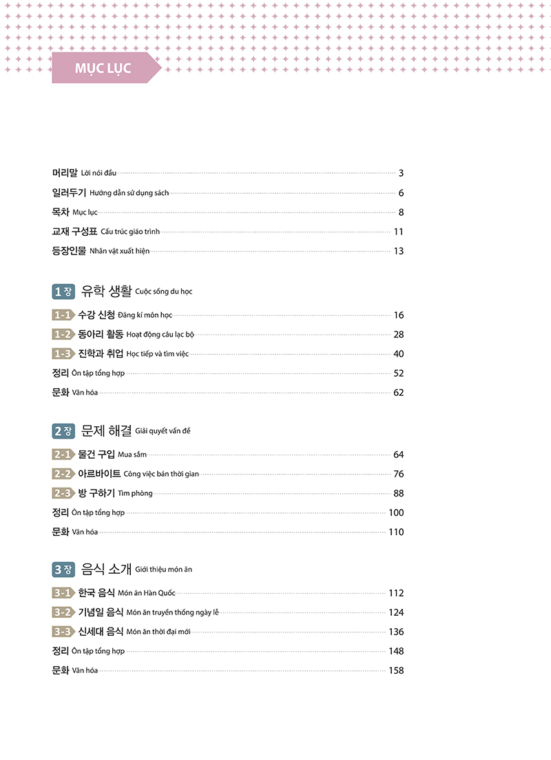 Vitamin Tiếng Hàn 3 bao gồm năm chương và mỗi chương sẽ tập trung nghiên cứu từng chủ đề riêng biệt, trong đó mỗi chương sẽ bao gồm ba bài học và một bài ôn tập.