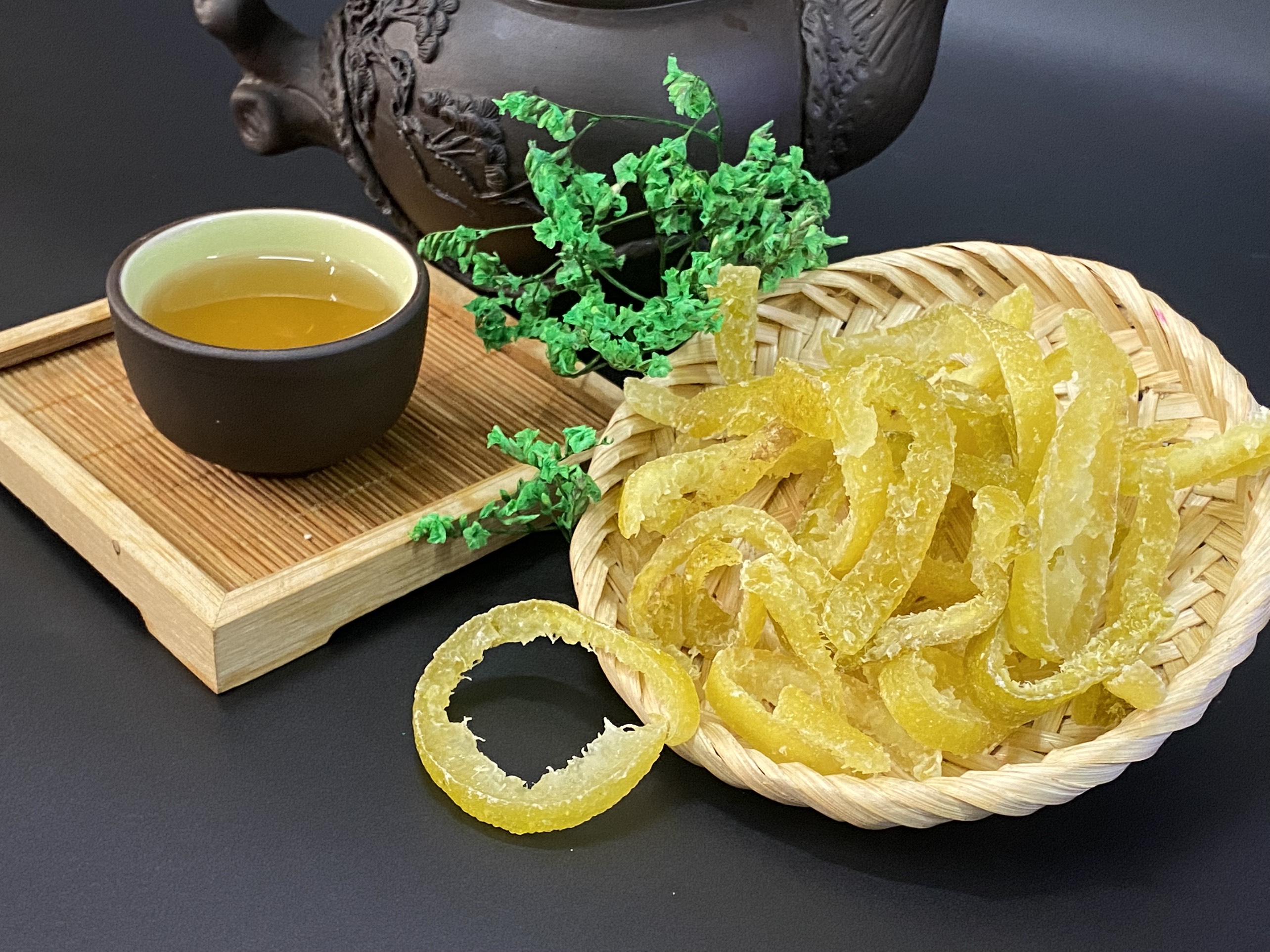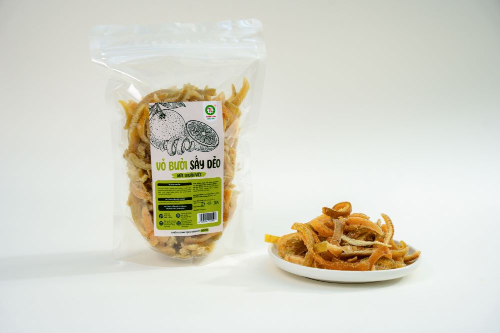 VỎ BƯỞI SẤY DẺO Mứt Thuần Việt THÀNH PHẦN : Vỏ Bưởi (70%), đường tinh luyện, muối i-ốt, chất bảo quản (E202), chất chống oxy hóa (E223), chất điều chỉnh độ acid: Acid Tartaric (E334)