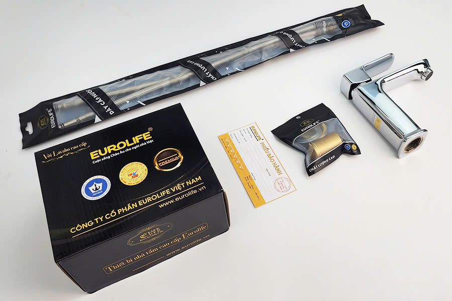 Vòi Lavabo nóng lạnh Đồng mạ Chrome Eurolife EL-8002 ️Thương hiệu Eurolife Việt Nam ️ Chất liệu : Sản phẩm được đúc trọng lực với hợp kim đồng 61% , mạ Chrome và Niken (Ni -10micro , Cr-0.3micro). Độ bóng sáng cao và không bị dính két vết bẩn. ️ Màu sắc : Trắng bạc ( Crôm Bóng sáng) ️Trọng lượng : 1006Grs ️Bảo hành : 5 năm ️Sản phẩm chất lượng cao, không bong tróc lớp men (lớp mạ) khi sử dụng trong thời gian dài. Tuổi thọ lớp men lên tới 20 năm. CHI TIẾT SẢN PHẨM =================== CHẤT LIỆU AN TOÀN ️ Thân vòi được đúc từ Đồng H61, đạt tiêu chuẩn Châu Âu cho vật liệu. An toàn cho người sử dụng và thân thiện với môi trường. MẠ CHROME 5 LỚP ️ Thân vòi được mạ 5 lớp với 1 lớp mạ Đồng, 2 lớp mạ Kẽm, 1 lớp mạ Niken bên trong và lớp Chrome bên ngoài với độ dày lên tới 11um, giúp vòi luôn sáng bóng và không bị nổ xi, bong tróc lớp mạ khi sử dụng ( Đã được Quatest 3 chứng nhận). THIẾT KẾ ƯU VIỆT ️ Thân vòi với chiều cao, tạo cảm giác thoải mái, phóng khoáng khi sử dụng. Thuận tiện khi rửa mặt và xả nước. CÔNG NGHỆ TẠO BỌT DÒNG CHẢY ️ Đầu vòi với thiết kế dòng nước đan chéo xen kẽ nhau, tạo bọt, chống văng bắn và tiết kiệm nước. ️ Đầu vòi có thể tháo rời để vệ sinh lưới lọc bên trong khi cần thiết. ️ Áp lực nước mạnh mẽ, không văng bắn khi sử dụng. ️ Thân vòi cao với thiết vuông, tạo cảm giác khỏe khoắn và sang trọng cho phòng tắm. ️ Tay cầm thiết kế vuốt vuông, dễ cầm nắm, giúp đóng mở nguồn nước dễ dàng. Logo Eurolife được in trên tay cầm cùng tem điện tử thông minh chống hàng giả, có thể truy xuất nguồn gốc được dán sau lưng sản phẩm. BÁT GẮN VÀ DÂY KẾT NỐI ️ Bát gắn bằng Đồng thau bền bỉ, Ren gắn 32mm, phù hợp với các loại lỗ chờ của Lavabo. Bát siết có đường kính 44mm. ️ Chiều dài ống gắn 46mm, có thể gắn cho nhiều mặt đá dày. ️ Bát gắn bằng chắc chắn và cứng cáp cho việc lắp đặt, đi kèm 2 roong cao su đệm bên trên và bên dưới thành chậu. ️ Dây cấp dài 50cm chịu nhiệt cao. Thân dây bằng Inox, 2 đầu ren được đúc bằng Đồng thau bền bỉ. Hai dây hoàn toàn có thể chịu nhiệt độ cao lên đến 100 độ C. Ống dẫn được làm từ cao su tổng hợp EDPM .Cao su EPDM có dãy nhiệt độ làm việc từ -50° C tới 120°/ 150°C (- 60° F tới 250°/ 300°F). Tính chất nổi bật của loại vật liệu EPDM là nhờ khả năng kháng được rất tốt với các loại dung môi, axit loãng, kiềm loãng, hơi nước, ánh sáng mặt trời, tác động của tia ozon và làm việc được trong môi trường nhiệt độ cao. TRÁI TIM SẢN PHẨM ️ Eurolife sử dụng van Ceramic JJ - thương hiệu nổi tiếng và chất lượng cao của Đài Loan cho các sản phẩm. Van Ceramic với 160.000 lần sử dụng (tương ứng với 30 lần sử dụng trên ngày trong suốt gần 15 năm liên tục). Van lớn được thiết kế độc quyền bởi Eurolife cho dòng chảy tối đa 18l/min với áp suất 0.5MPA, giúp van chảy cực mạnh kể cả khi áp lực yếu. THÔNG SỐ SẢN PHẨM ️ Trọng lượng thực tế của sản phẩm : 1006 Grs BẢN VẼ KỸ THUẬT ĐÓNG GÓI SẢN PHẨM ️ Bộ sản phẩm đầy đủ bao gồm : 1- Thân vòi Lavabo 2- Bộ 2 dây Inox SUS 304, 1 bát lắp đặt, 2 roong cao su 3- Sách hướng dẫn sử dụng kèm thẻ bảo hành Sản phẩm của Eurolife đã được Trung tâm kỹ thuật tiêu chuẩn đo lường Chất lượng 3 (Quatest 3) phân tích thử nghiệm và chứng nhận: ️ Độ dày lớp mạ lên tới 11um. ️ Tỉ lệ vật liệu đạt tiêu chuẩn