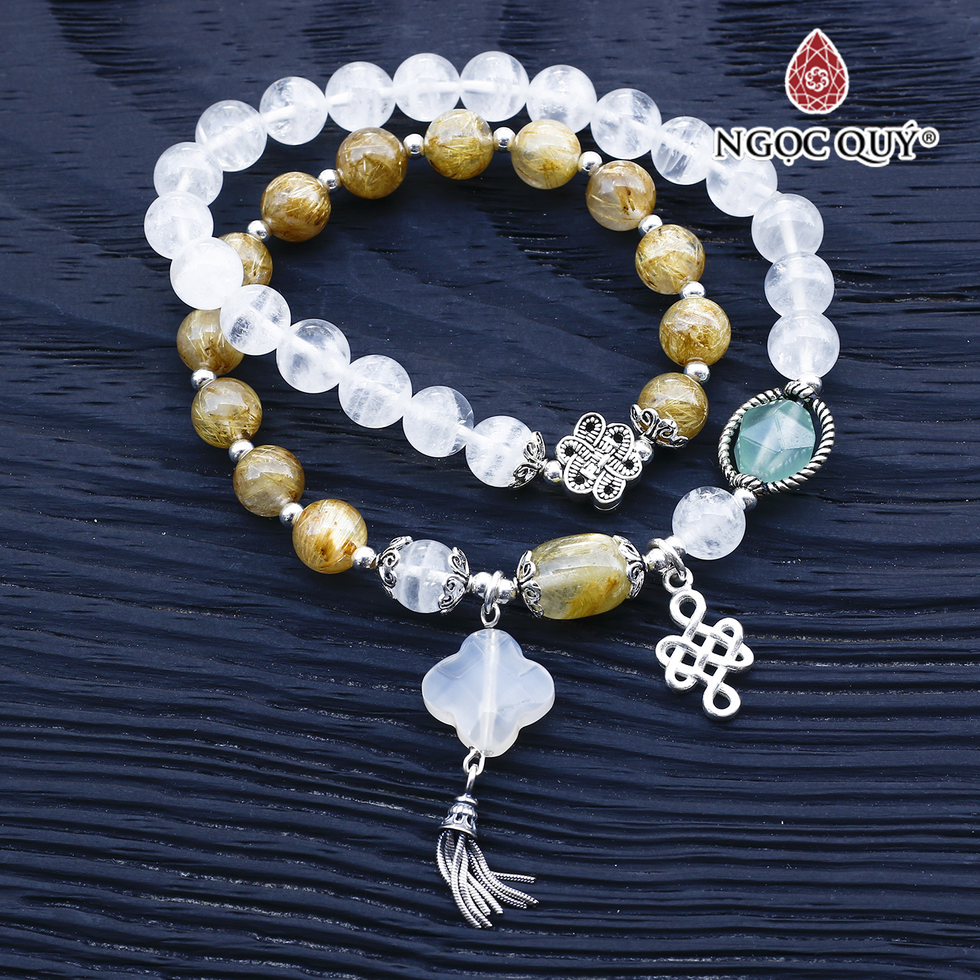 Vòng tay 2line đá thạch anh tóc vàng & ưu linh trắng phối charm | Ngọc Quý Gemstones |