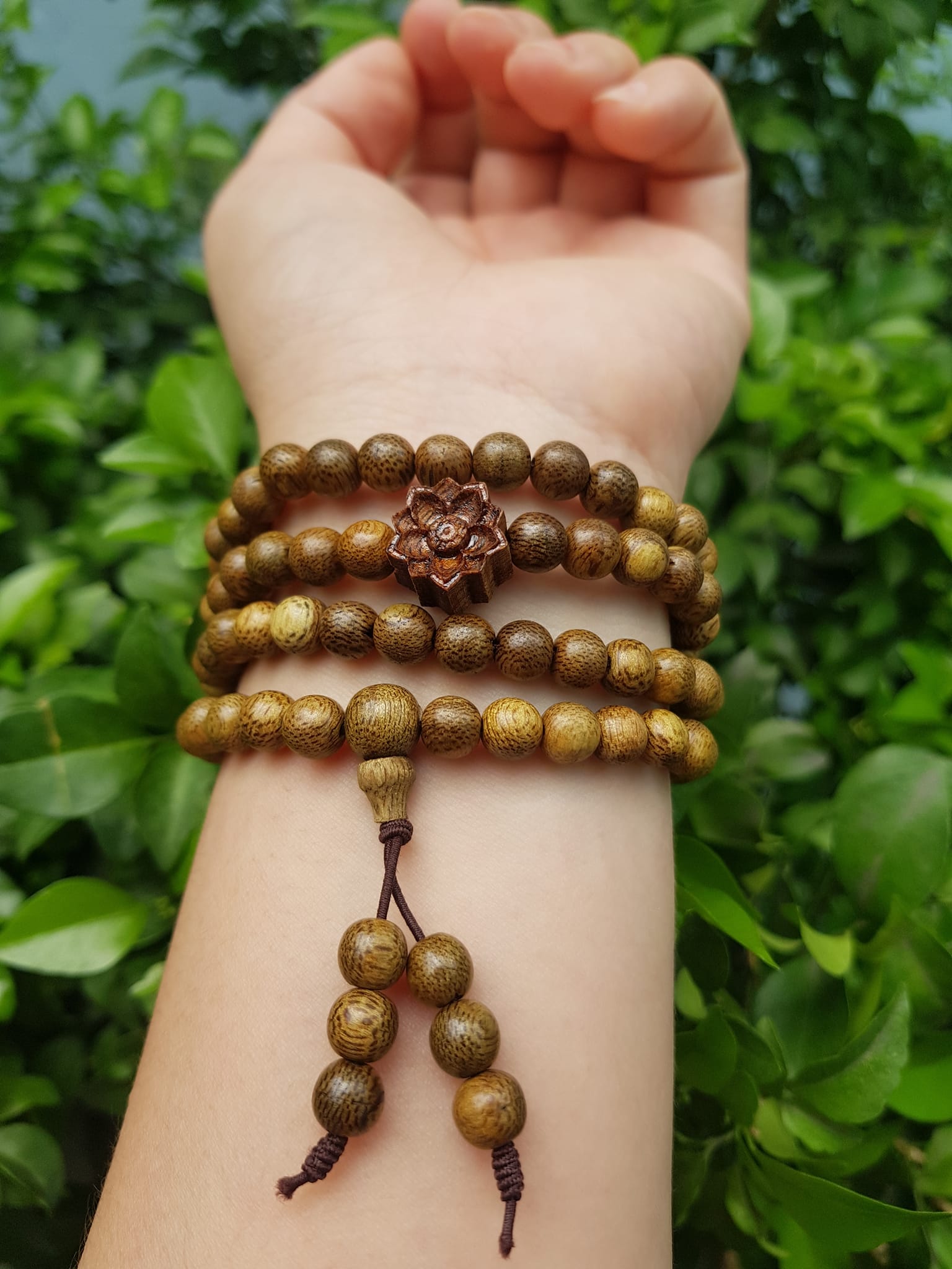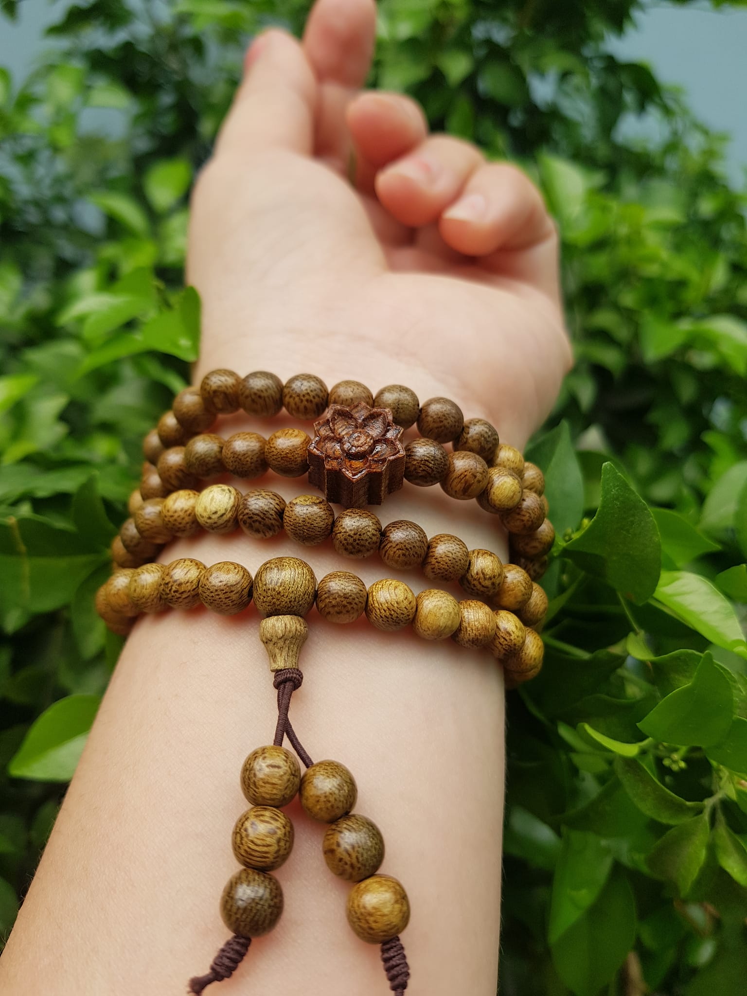✨Vòng đeo tay nữ gỗ trầm mix bông hoa sen kiểu quấn tay 4 vòng may mắn tài lộc Size hạt 6mm Màu vàng nâu vân sáng nhẹ đeo tay rất đẹp xinh mùi thơm nhẹ nhẹ ạ