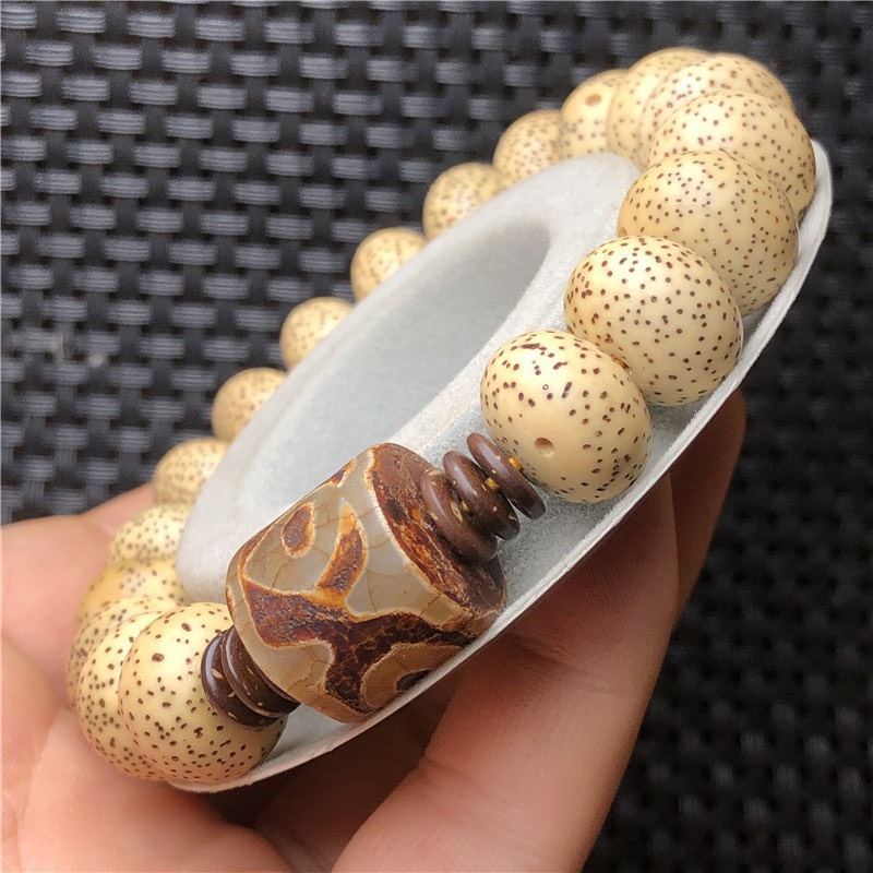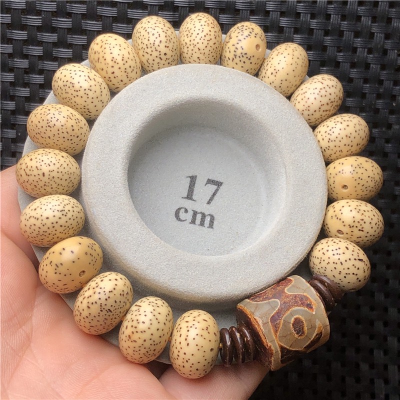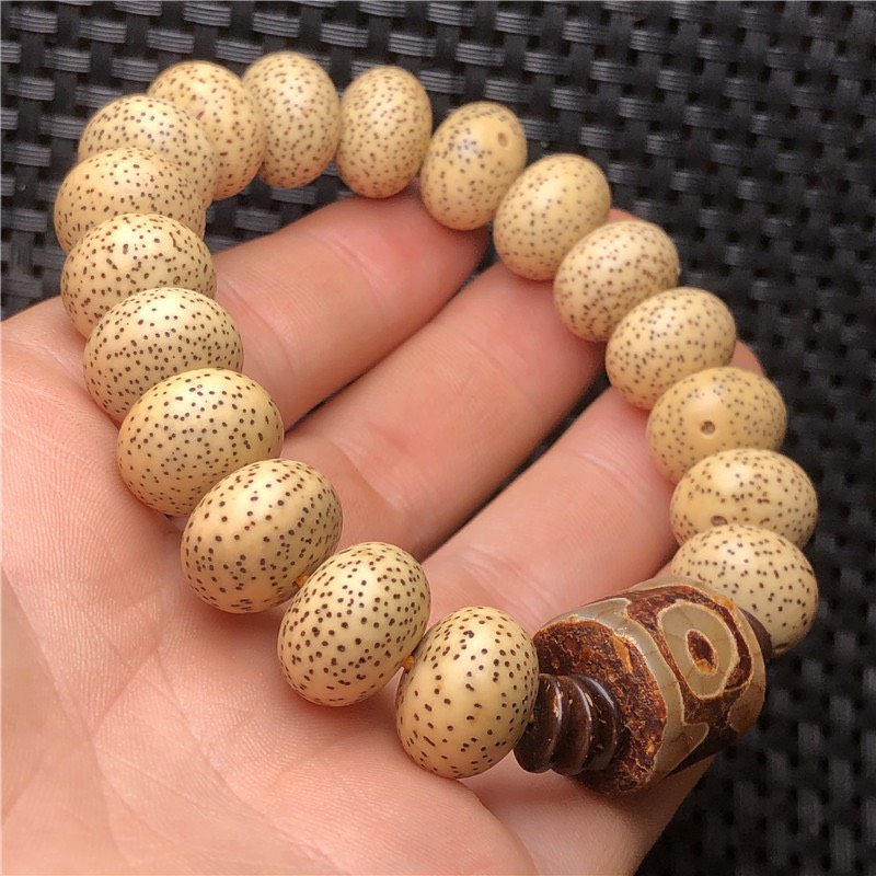- Đeo lâu sẽ chuyển màu ( lên nước ) , màu sắc hạt có thể chuyển màu vàng ( sau 1-3 tháng ) ; nâu gỗ sậm hơn theo thời gian đeo ( sau 1-2 năm ( tùy vào môi trường, cơ địa người sử dụng) . TẠI SAO GỌI LÀ BỒ ĐỀ TINH NGUYỆT ? Sở dĩ gọi là Bồ Đề Tinh Nguyệt vì mỗi hạt có một chấm to tượng trưng cho trăng, các chấm nhỏ xung quanh tượng trưng cho sao. Bồ đề tinh nguyệt là 1 trong số các chuỗi hạt Quý, Vua Ấn Độ Tỳ Lưu Ly thỉnh Đức Phật Thích Ca dạy cho pháp môn diệt trừ phiền não, Phật dạy nhà vua dùng hạt một loại cây gọi là “Vô Hoạn Tử” hay là “Bồ Đề Tử” xâu thành chuỗi để niệm danh hiệu Phật thì sẽ tiêu trừ mọi phiền não. CÔNG DỤNG CỦA BỒ ĐỀ TINH NGUYỆT : Chuỗi được dùng để lần niệm Phật , đeo tay mang ý nghĩa cát tường, cầu bình an, may mắn, hạnh phúc. Nói về công đức của người lần chuỗi Bồ Đề Niệm Phật, Kinh Hiệu Lượng Sổ Châu Công Đức chép rằng: “Bồ tát Văn Thù Sư Lợi vì muốn đem lợi ích cho mọi hữu tình dùng tâm đại bi bảo đại chúng rằng: – Nếu ai dùng sắt làm tràng hạt mà trì tụng một lần phước bằng 5 lần không niệm. – Nếu ai dùng đồng đỏ làm tràng hạt mà trì tụng một lần phước bằng 10 lần không niệm – Nếu ai dùng thất bảo(vàng, bạc, san hô, hổ phách, mã não…) làm tràng hạt mà trì tụng một lần phước bằng 100 lần không niệm – Nếu ai dùng hạt Mộc hoạn tử làm tràng hạt mà trì tụng một lần phước bằng 1.000 lần không niệm. – Nếu ai dùng hạt sen làm tràng hạt mà trì tụng một lần phước bằng 10.000 lần không niệm. – Nếu ai dùng hạt Bồ đề làm tràng hạt mà cầm, đeo hoặc trì tụng thì phước đức đó không sao tính được. ️️️Thật là duyên lành cho quí vị nào sỡ hữu tràng hạt Bồ Đề Tinh Nguyệt, để hàng ngày có thể chuyên tâm Niệm Phật với những lợi ích lớn không thể nghĩ bàn. Từ xưa đến nay chuỗi hạt Bồ Đề được xem như vật may mắn để mang bên mình. Bạn sẽ cảm thật yên tâm hơn, tự tin hơn khi đeo vòng hạt bồ đề cát tường này