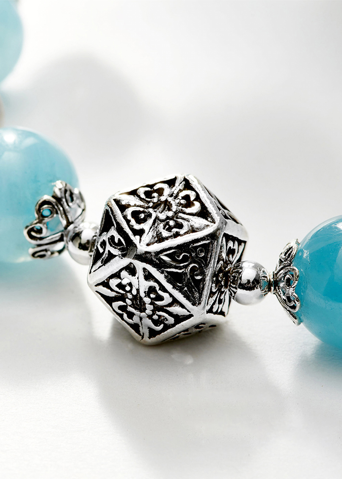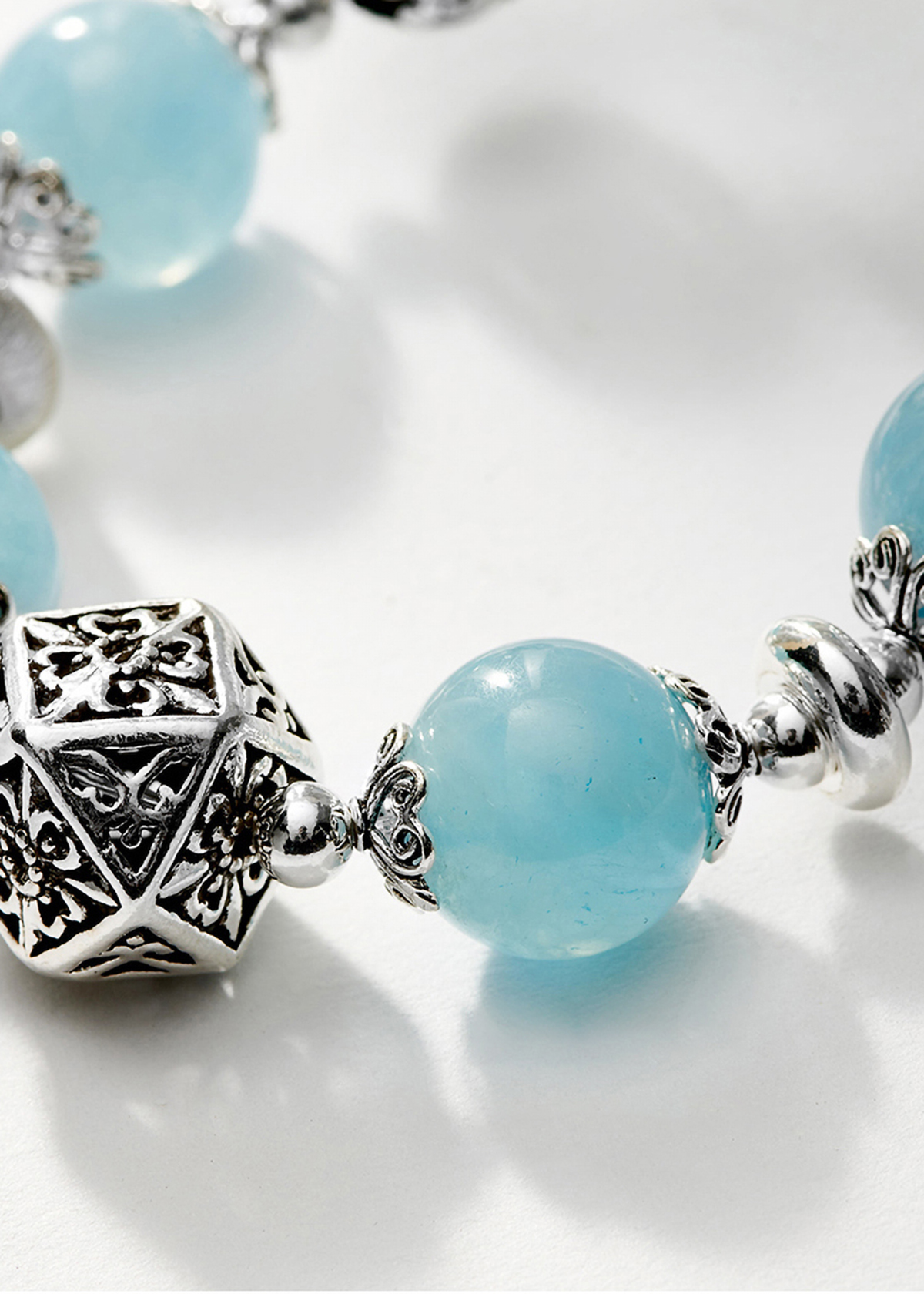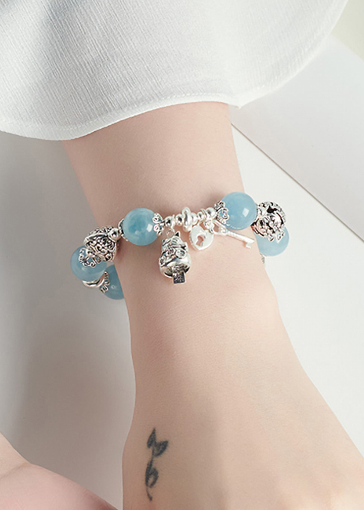 VÒNG TAY ĐÁ AQUAMARINE PHỐI CHARM MÈO BẠC: