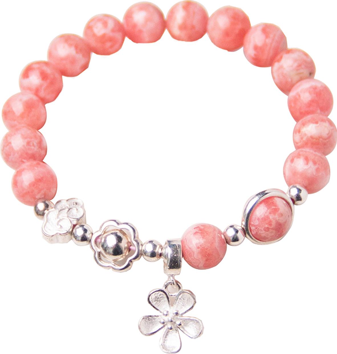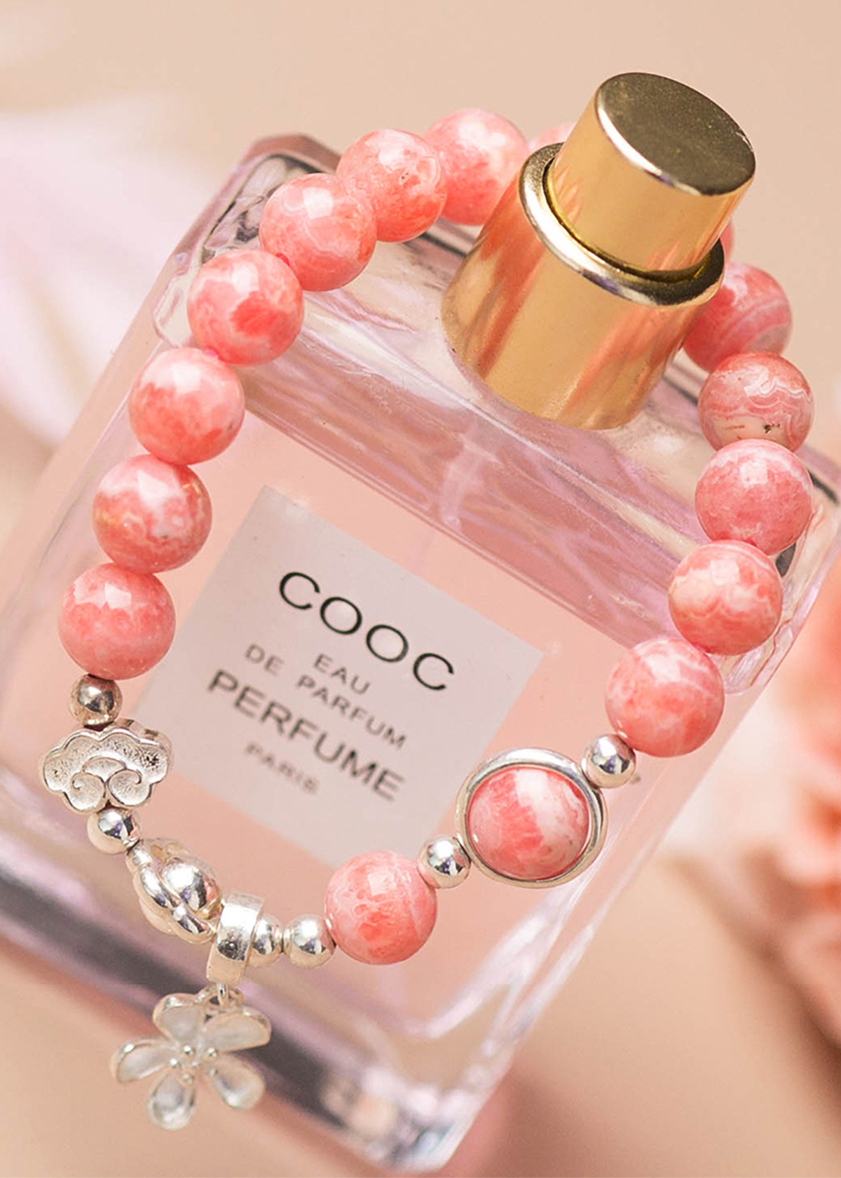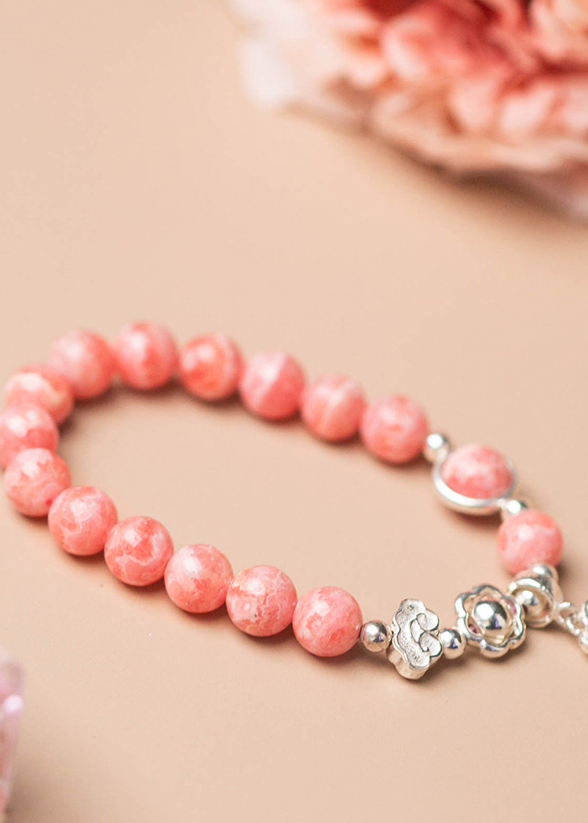 Vòng Tay Đá Rhodochrosite Phối Charm Hoa : Trong Hy Lạp, Đá Đào Hoa hay Rhodochrosite có nghĩa là màu hồng, biểu tượng của tình yêu trong văn hóa người Inca. Theo truyền thuyết, những viên đá màu hồng này được hình thành từ máu của các vị vua và hoàng hậu thời cổ đại.