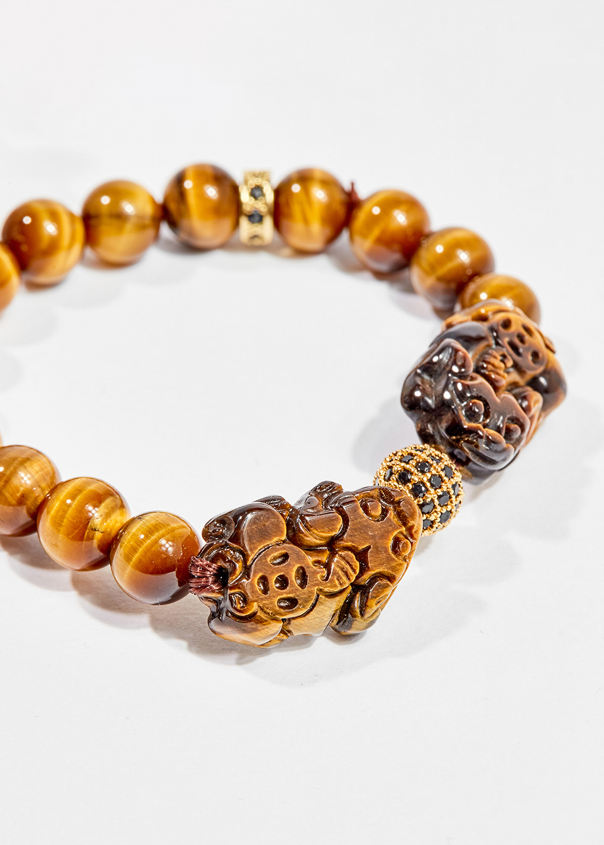VÒNG TAY ĐÁ MẮT HỔ VÀNG NÂU CHARM TÌ HƯU: Theo truyền thuyết, Tì Hưu là linh vật đầu rồng thân lân, có sừng nhưng không có hậu môn, vì thế có khả năng thu