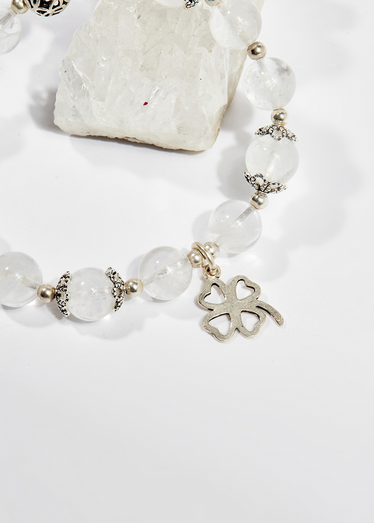 ✨Vòng tay phong thủy nữ đá thạch anh ưu linh trắng charm cỏ 4 lá 8mm mệnh thủy , kim - Ngọc Quý Gemstones