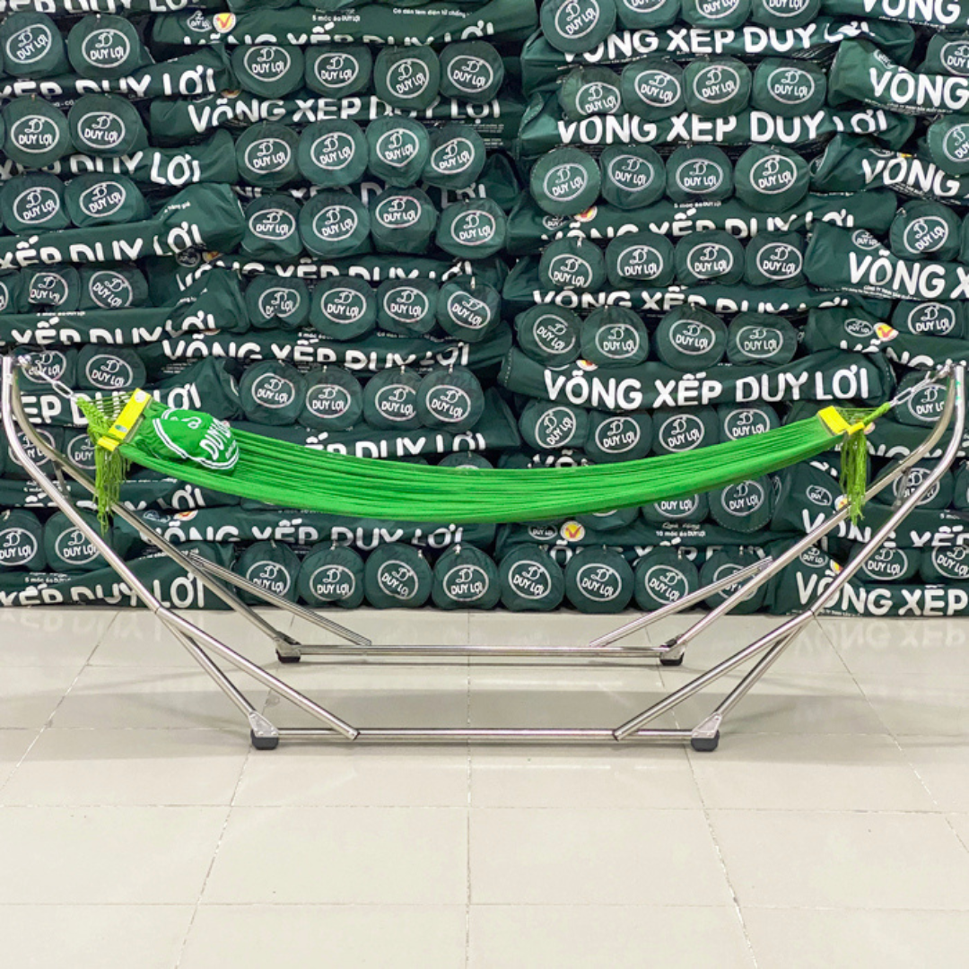 Võng xếp khung thép Duy Lợi cỡ đại dài 2.8m. Thương hiệu : Duy Lợi Xuất xứ : Việt Nam Màu sắc: Khung võng màu xám, võng lưới màu xanh lá. Sản phẩm bao gồm
