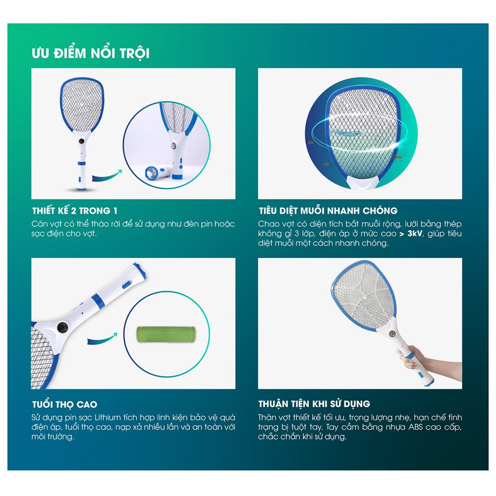 - Vợt Muỗi 2 Trong 1 Lithium Nakagami sử dụng Pin Lithium, có chất lượng tốt hơn, tuổi thọ pin bền hơn, dung lượng nhiều hơn, lâu hêt pin hơn. - Vợt muỗi cải tiến