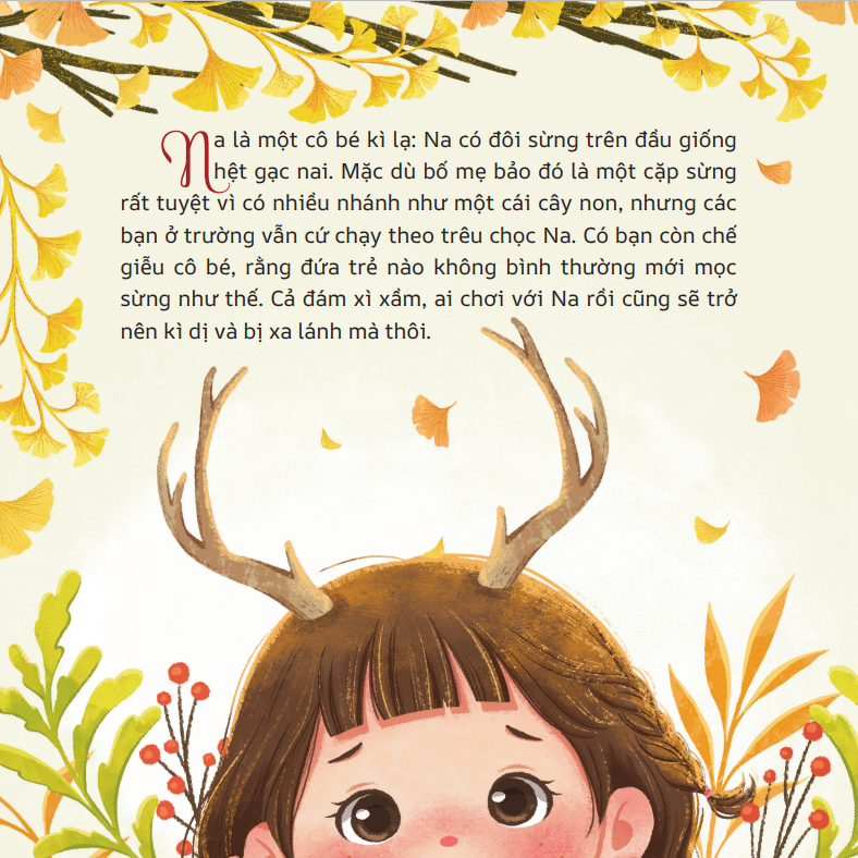 "Na là một cô bé kỳ lạ: Na có đôi sừng trên đầu giống hệt gạc nai. Mặc dù bố mẹ bảo đó là một cặp sừng rất tuyệt vì có nhiều nhánh như một cái cây non, nhưng các bạn ở trường vẫn cứ chạy theo trêu chọc Na. Có bạn còn chế giễu cô bé, rằng đứa trẻ nào không bình thường mới mọc sừng như thế. Cả đám xì xầm, ai chơi với Na rồi cũng sẽ trở nên kỳ dị và bị xa lánh mà thôi."