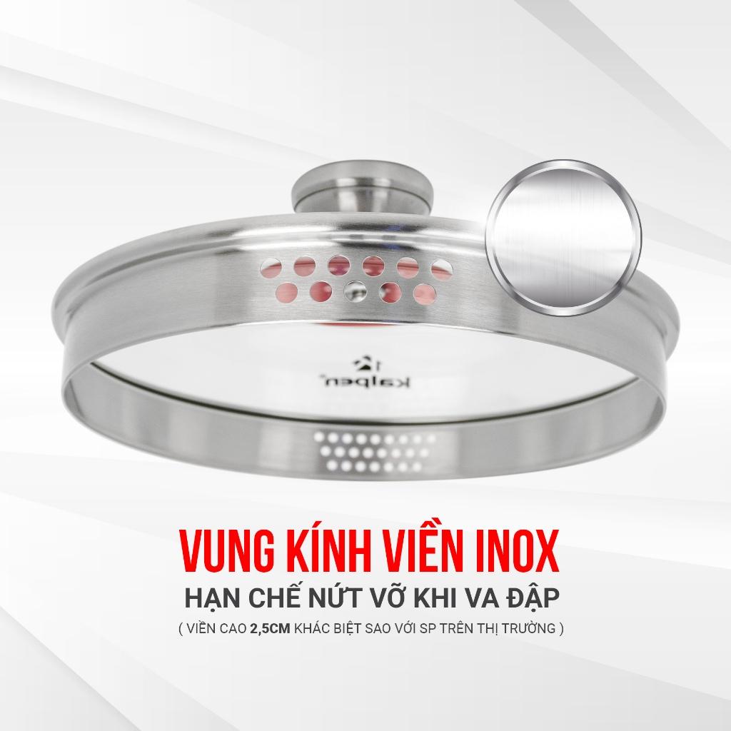 Viền inox không gỉ cao cấp: Nắp vung kính Kalpen có viền inox cao 2.5cm, giúp tăng độ bền, tránh bị vỡ hoặc hư hỏng khi va đập.
