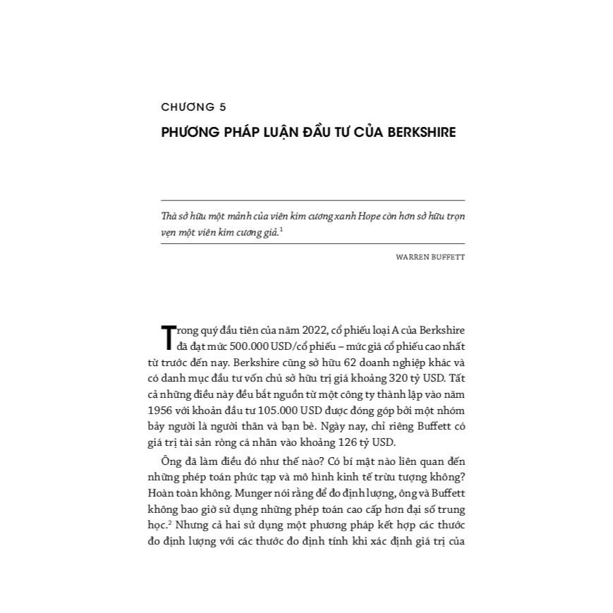 Sách - Warren Bufett Nhà Đầu Tư Và Doanh Nhân Khởi Nghiệp Warren Buffett có thể được coi là nhà đầu tư thành công nhất mọi thời đại. Là CEO và chủ tịch của Berkshire Hathaway, ông được ngưỡng mộ không chỉ vì thành tích trong lĩnh vực tài chính mà còn cả vì triết lý đầu tư của mình. Nhưng có một điều ít người biết về Warren Buffett là tuy là một nhà đầu tư nổi tiếng, nhưng một trong những bí quyết thành công của ông chính là điều hành Berkshire Hathaway với tinh thần khởi nghiệp. Trong cuốn sách này, tác giả Todd A. Finkle, một người bạn lâu năm của gia đình Buffett, sẽ cung cấp cho bạn những góc nhìn mới mẻ về sự nghiệp của Buffett trong tư cách một nhà đầu tư và doanh nhân khởi nghiệp. "Warren Buffett: Nhà đầu tư và doanh nhân khởi nghiệp" không chỉ chia sẻ câu chuyện hấp dẫn về thuở đầu lập nghiệp và những dự án kinh doanh của Buffett mà còn ghi lại những thương vụ đầu tư đã làm nên sự nghiệp của ông, từ việc bán kẹo cao su đến từng nhà thời thơ ấu đến thành lập Berkshire Hathaway và phát triển nó thành một tập đoàn toàn cầu như ngày nay. Finkle còn xem xét phương pháp đầu tư, chiến lược quản lý và triết lý quản trị của Buffett. Ngoài ra, ông cũng không quên người cộng sự lâu năm của Buffett, Charlie Munger, và những đóng góp của Munger cho thành công của Berkshire. Bên cạnh đó, cuốn sách cũng rút ra những bài học từ những sai lầm trong đầu tư của Buffett, và thông qua những thất bại này khám phá cách thay đổi hành vi, khắc phục thiếu sót và thiên kiến trong đầu tư. Không chỉ điều hành Berkshire Hathaway, Buffett còn nổi tiếng với việc làm từ thiện, lối sống giản đơn, cũng như những triết lý sống đề cao sự liêm chính và sống có ý nghĩa. Bên cạnh phương pháp đầu tư và kinh doanh, ta còn có thể học hỏi về ông với tư cách một con người, và cuốn sách đã không bỏ qua điều này. Từ việc nuôi dạy con cái, những cuộc gặp gỡ thường niên với sinh viên các trường đại học đến những phong trào từ thiện do ông đi đầu, bạn có thể tìm thấy thêm nhiều niềm cảm hứng từ ông.