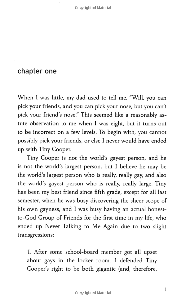 One cold night, in a most unlikely corner of Chicago, Will Grayson crosses paths with . . . Will Grayson. Two guys with the same name, running in two very different circles, suddenly find their lives going in new and unexpected directions, and culminating in epic turns-of-heart and the most fabulous musical ever to grace the high-school stage.