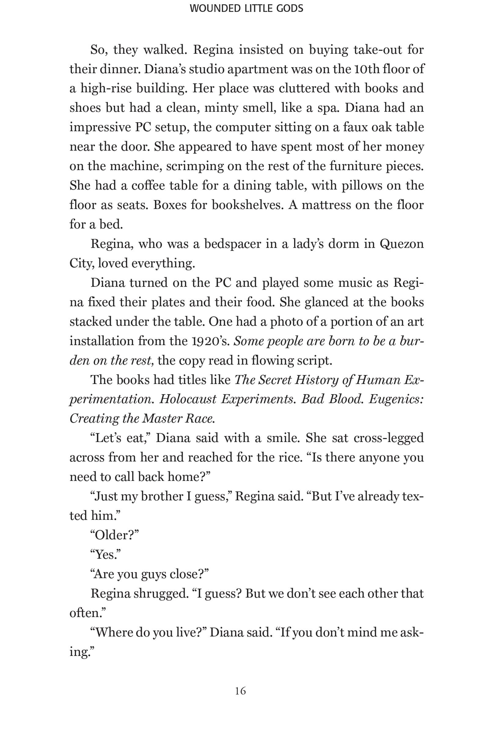 Wounded Little Gods is a tale that brings mythology to a sci-fi thriller that's filled with a sense of place--a place where gods are in many ways human and point to the ways in which humans can be inhumane. As Regina struggles to unwind the knots surrounding the mystery of this facility and the people connected to it. She discovers that she is more intertwined in the strange events in her hometown than she ever knew.