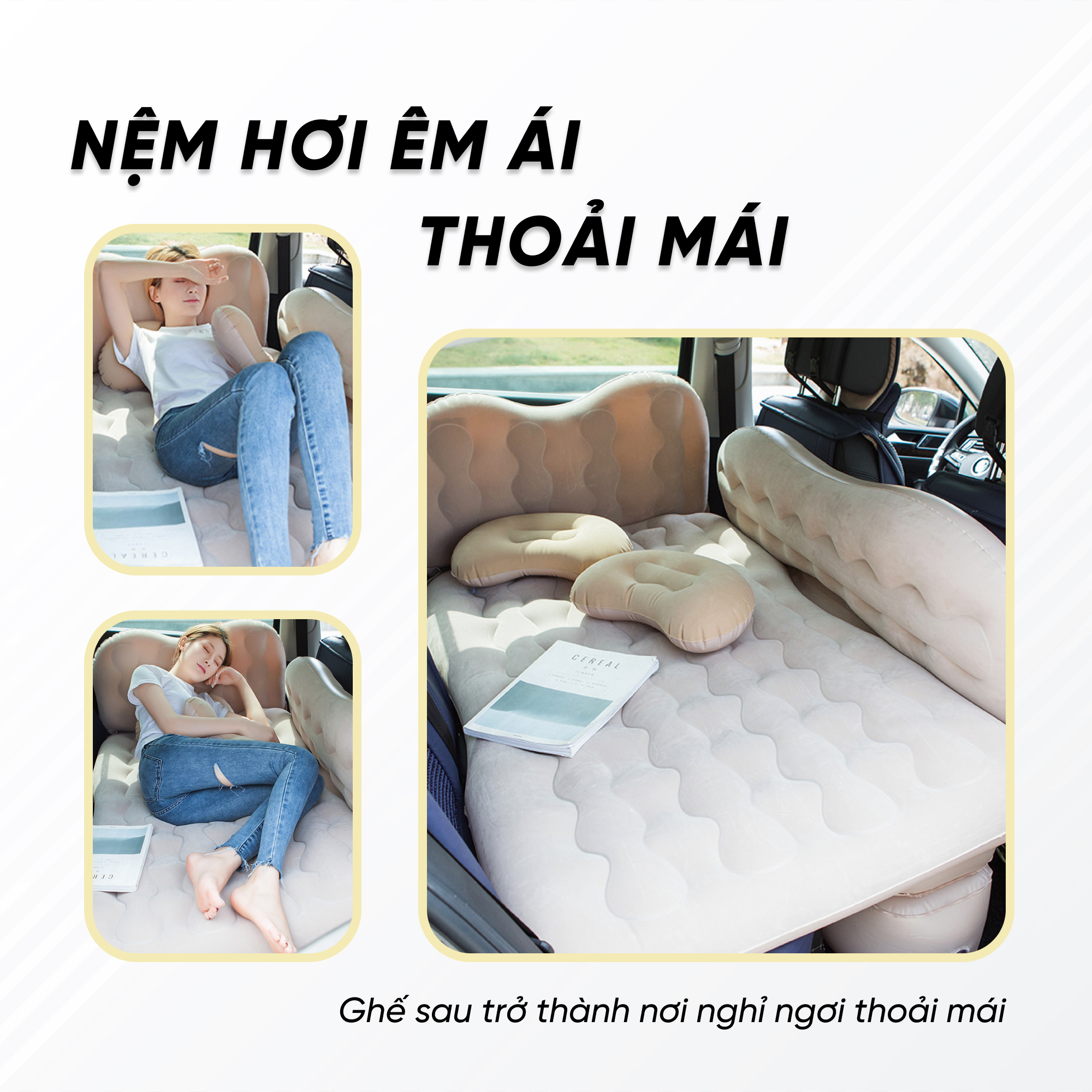 - Nệm hơi cho ô tô là một món đồ không thể thiếu, được thiết kế đặc biệt để cung cấp sự thoải mái khi bạn cần nghỉ ngơi trong xe hơi. Nệm nhỏ gọn và dễ dàng để mang theo khi di chuyển hoặc đi du lịch.