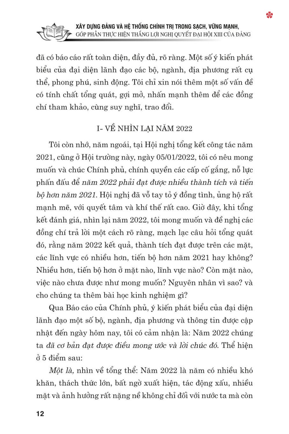 Mua tại TiktokCuốn sách “Xây dựng Đảng và hệ thống chính trị trong sạch, vững mạnh, góp phần thực hiện thắng lợi Nghị quyết Đại hội XIII của Đảng” tuyển chọn các bài phát biểu, bài viết, bài trả lời phỏng vấn, thư, điệ tiêu biểu của đồng chí Tổng Bí thư Nguyễn Phú Trọng trong năm 2023, cho thấy sự chỉ đạo sát sao, tâm huyết của người đứng đầu Đảng ta với các vấn đề quan trọng của đất nước trong năm 2023 - năm bản lề thực hiện Nghị quyết Đại hội XIII của Đảng.