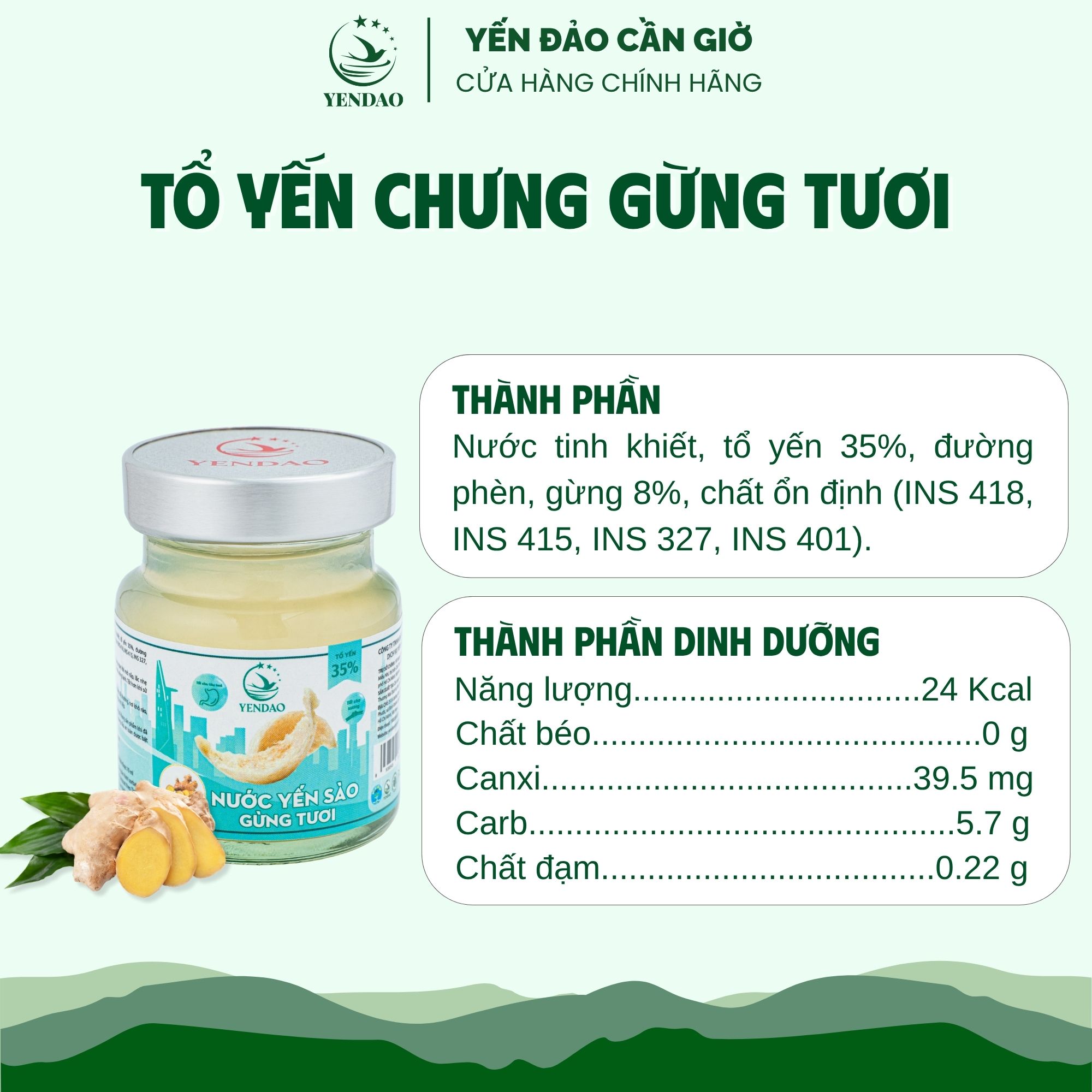- Mô tả: Yến Hũ Gừng Tươi được chưng từ tổ yến xanh sạch Cần Giờ kết hợp gừng tươi, giữ trọn dưỡng chất và hương vị tự nhiên. Sản phẩm giàu dinh dưỡng, hỗ trợ bồi bổ sức khỏe, tăng đề kháng, tiện lợi sử dụng hàng ngày hoặc làm quà tặng cao cấp cho gia đình, bạn bè. THÔNG TIN SẢN PHẨM